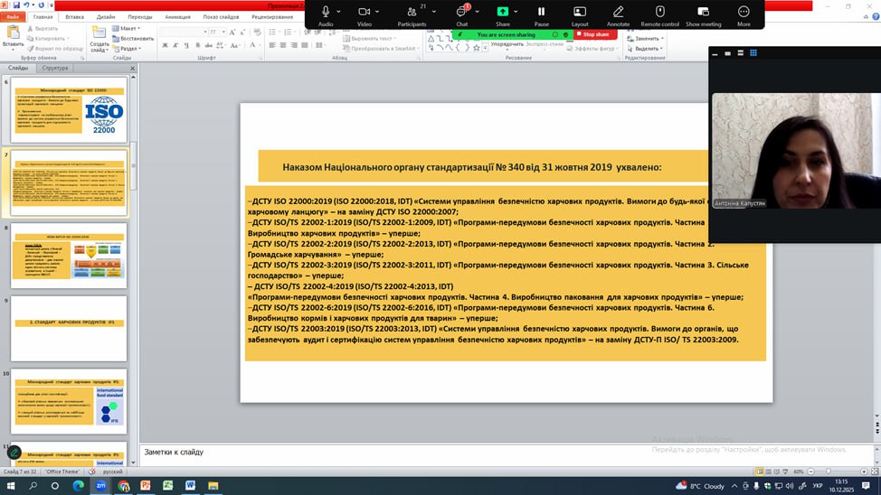 З 1-го по 18 грудня 2025 р. на кафедрі «Харчової хімії експертизи та біотехнологій» було проведено курси підвищення кваліфікації за підтримки МОН «Міжнародні стандарти якості та безпеки харчової продукції» для 80-ти осіб, які є представниками операторів ринку харчової промисловості із різних куточків України. Навчання проводили провідні фахівці кафедри проф. Капустян А.І., доценти Науменко К.І. та Гураль Л.С.