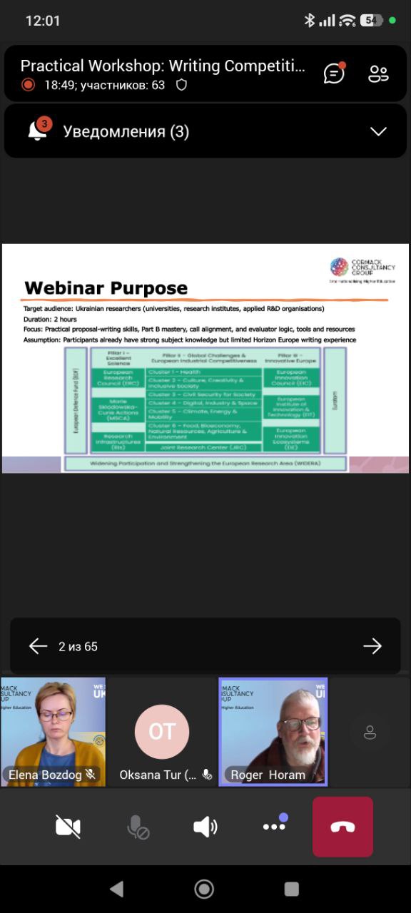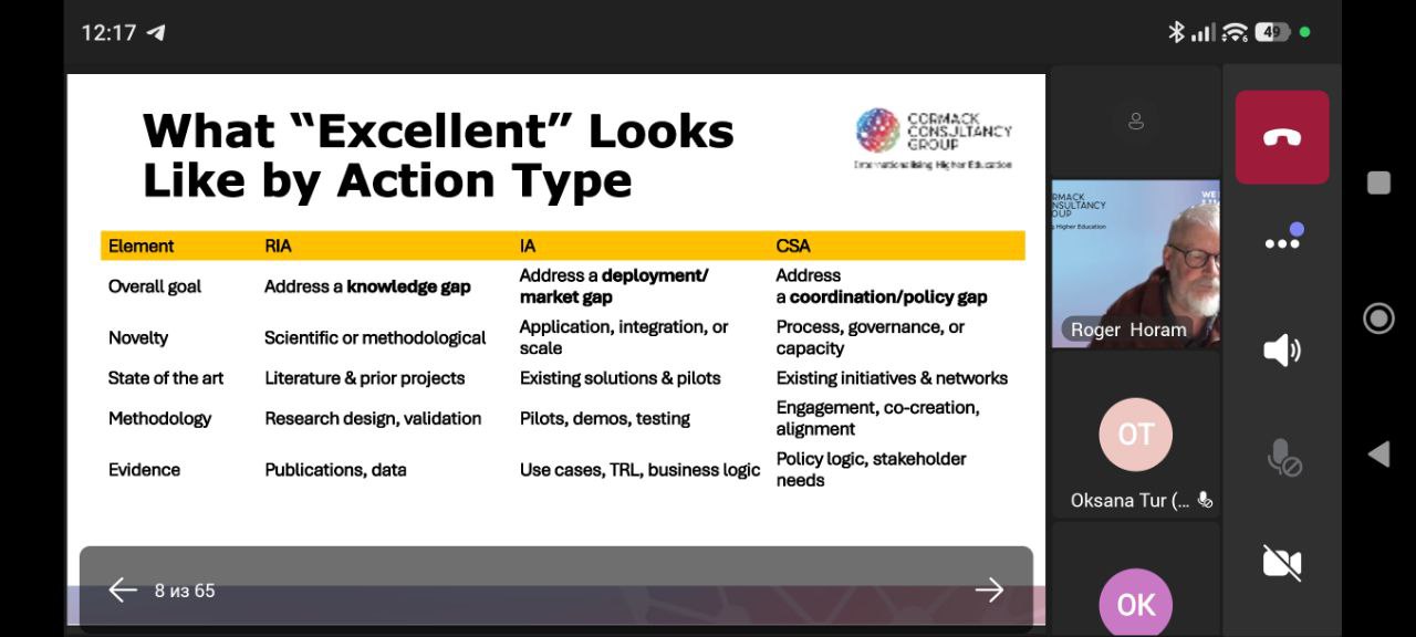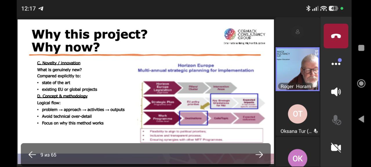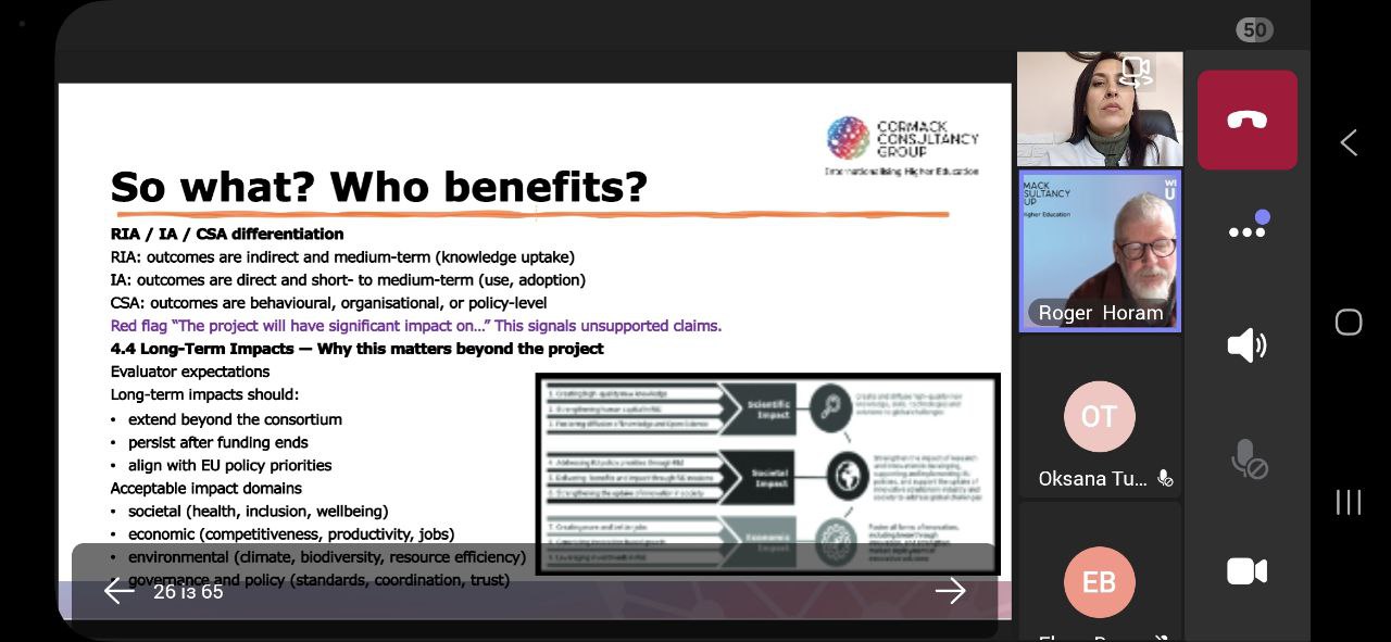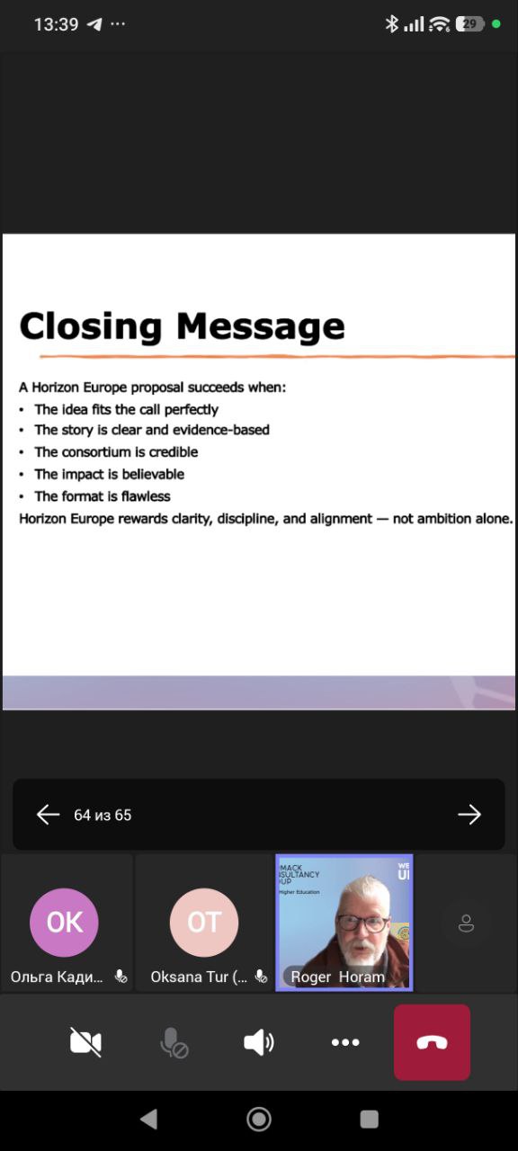 Під час практичного семінару з доповіддю виступив Роджер Хорам (Roger Horam) — міжнародний експерт з підготовки та оцінювання проєктів програми «Горизонт Європа», консультант Cormack Consultancy Group. Спікер поділився практичним досвідом написання конкурентоспроможних грантових пропозицій, зосередивши увагу на питаннях новизни, інноваційності та обґрунтування актуальності проєктів у сфері досліджень.