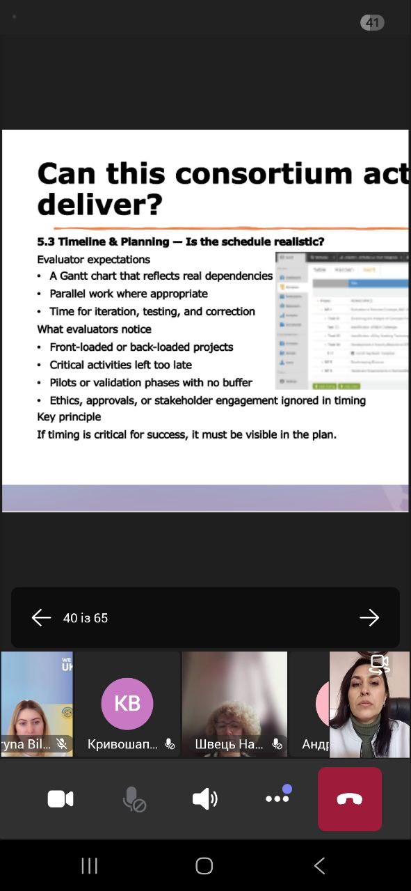 Відбувся практичний семінар «Написання конкурентоспроможних пропозицій програми “Горизонт Європа” (2026)», присвячений особливостям підготовки успішних грантових заявок. Учасники ознайомилися з основними вимогами програми, структурою проєктних пропозицій та критеріями оцінювання.